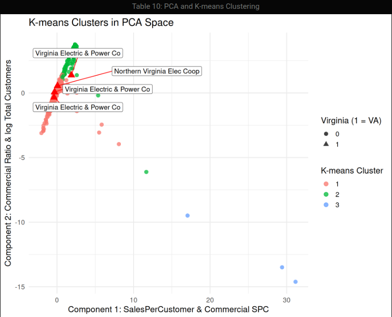 Key techniques include engineered intensity metrics, supervised classification models (logistic regression, ridge regression, random forests, KNN), and unsupervised methods (PCA and K-means). Results indicate that Virginia exhibits a higher concentration of load-intensive utilities once demand is weighted by commercial activity—consistent with observed data center expansion—while ridge-regularized and tree-based models provide the most stable and interpretable performance.